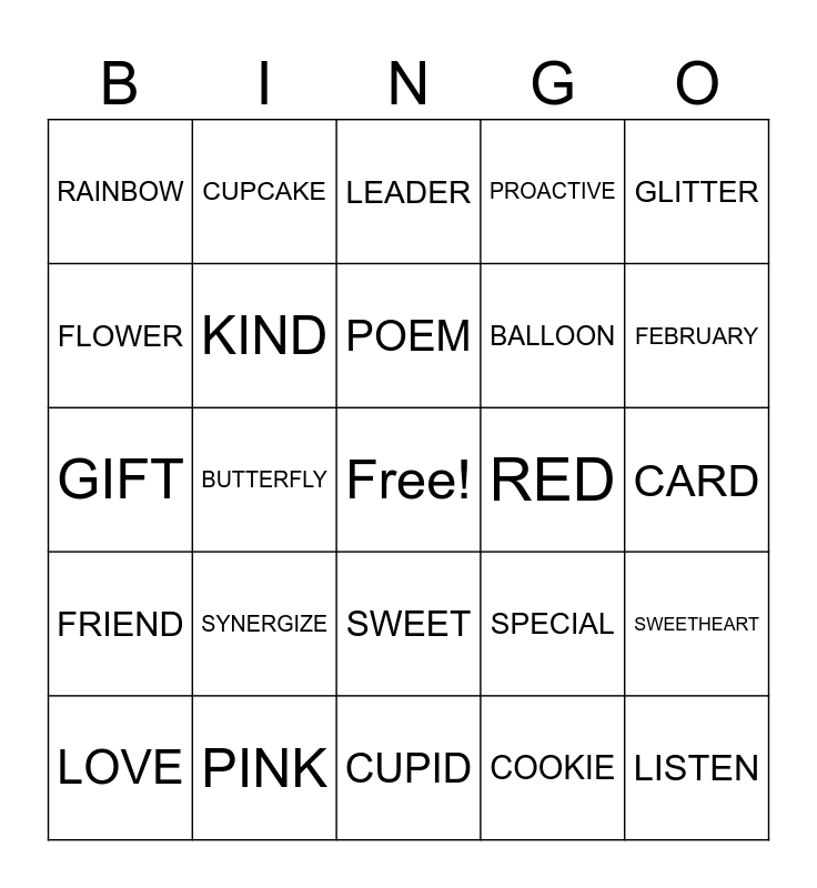 This bingo card has a free space and 32 words: LOVE, HEART, CUPID, CANDY, CARD, FLOWER, KIND, CHOCOLATE, BALLOON, VALENTINE, GIFT, CUPCAKE, RING, COOKIE, FEBRUARY, HUG, PINK, POEM, RED, SWEETHEART, FRIEND, ROSE, SWEET, SPECIAL, GLITTER, RAINBOW, BUTTERFLY, LEADER, PROACTIVE, LISTEN, WIN-WIN and SYNERGIZE.