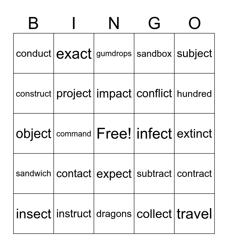 This bingo card has a free space and 24 words: contact, instruct, impact, insect, subject, conduct, construct, exact, infect, expect, conflict, object, subtract, contract, project, collect, extinct, gumdrops, hundred, command, travel, sandwich, sandbox and dragons.