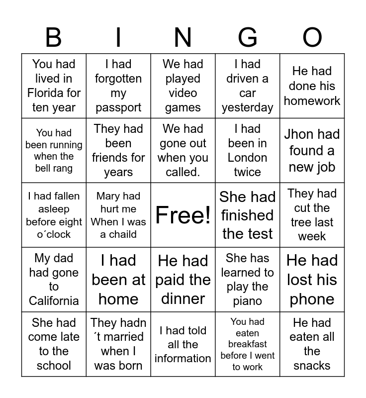 This bingo card has a free space and 24 words: I had been at home, They hadn´t married when I was born, We had gone out when you called., She had come late to the school, He had done his homework, You had lived in Florida for ten year, You had been running when the bell rang, I had forgotten my passport, She had finished the test, He had paid the dinner, I had been in London twice, I had fallen asleep before eight o´clock, She has learned to play the piano, He had lost his phone, They had been friends for years, You had eaten breakfast before I went to work, They had cut the tree last week, We had played video games, Jhon had found a new job, Mary had hurt me When I was a chaild, He had eaten all the snacks, My dad had gone to California, I had driven a car yesterday and I had told all the information.