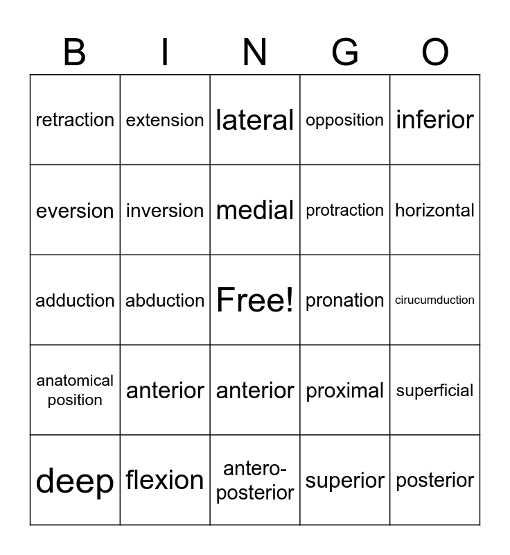 This bingo card has a free space and 32 words: superior, dorsiflexion, abduction, transverse plane, anatomical position, inversion, inferior, superficial, extension, sagittal plane, medial, lateral, plantar flexion, supination, pronation, frontal plane, deep, adduction, anterior, anterior, proximal, distal, cirucumduction, flexion, posterior, opposition, protraction, eversion, retraction, antero-posterior, longitudinal and horizontal.