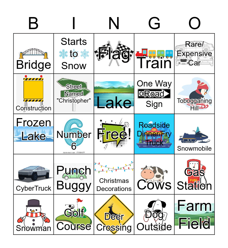 This bingo card has 24 images, a free space and 24 words: Snowman, Punch Buggy, Lake, Dog Outside, Rare/ Expensive Car, Bridge, Starts to Snow, Flag, Roadside Dinner/Fry Truck, Snowmobile, Frozen Lake, Street Named "Christopher", Cows, Gas Station, Construction, Golf Course, Deer Crossing, Train, Tobogganing Hill, CyberTruck, Number 6, Christmas Decorations, One Way Road Sign and Farm Field.