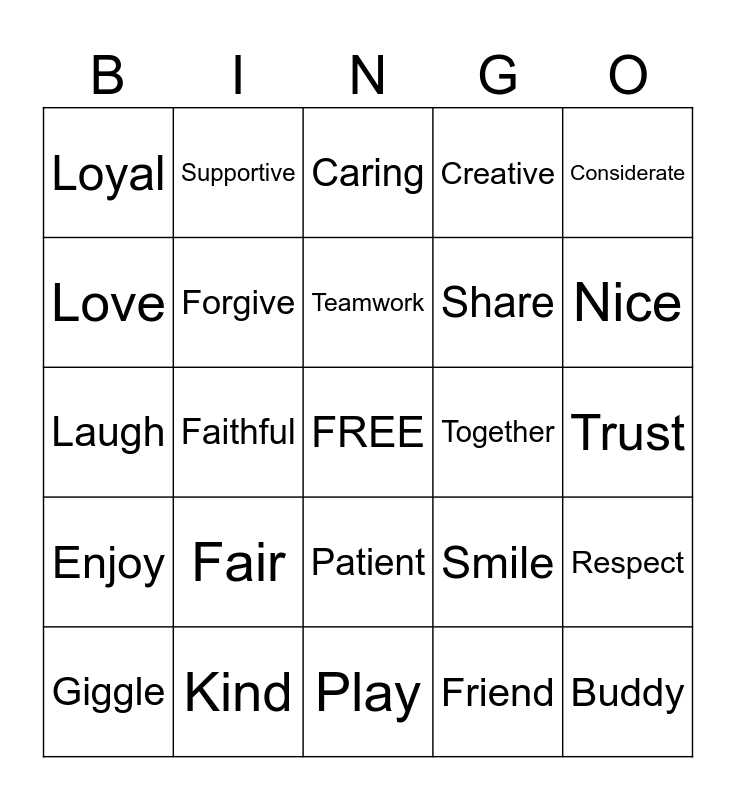 This bingo card has a free space and 29 words: Giggle, Honest, Faithful, Listen, Loyal, Caring, Forgive, Fair, Together, Kind, Trust, Buddy, Play, Friend, Nice, Encourage, Patient, Enjoy, Considerate, Laugh, Smile, Fun, Share, Love, Creative, Supportive, Respect, Teamwork and Help.