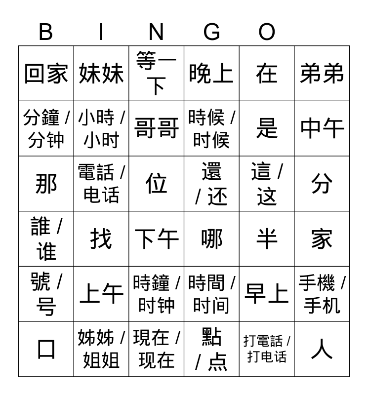 This bingo card has 36 words: 時間 / 时间, 時鐘 / 时钟, 點 / 点, 分鐘 / 分钟, 誰 / 谁, 還 / 还, 小時 / 小时, 現在 / 现在, 在, 早上, 中午, 晚上, 手機 / 手机, 電話 / 电话, 時候 / 时候, 回家, 號 / 号, 這 / 这, 那, 等一下, 位, 找, 哪, 下午, 半, 妹妹, 是, 姊姊 / 姐姐, 哥哥, 弟弟, 人, 口, 家, 分, 上午 and 打電話 / 打电话.