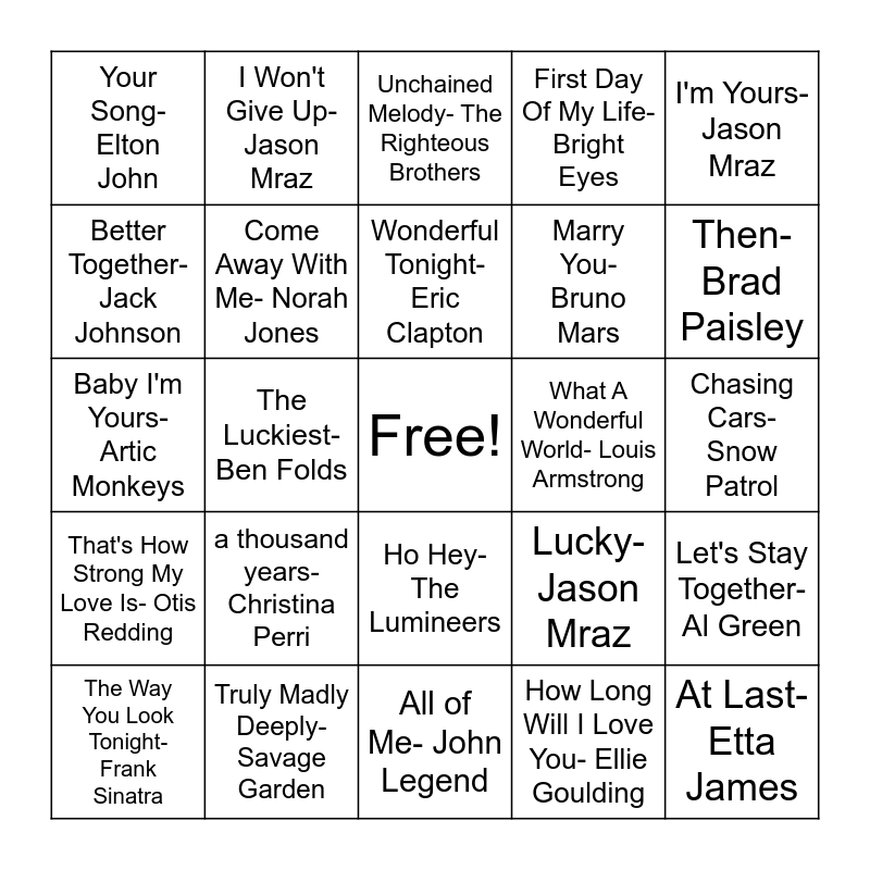 This bingo card has a free space and 50 words: Thinking Out Loud- Ed Sheeran, At Last- Etta James, You Are The Best Thing- Ray LaMontagne, All of Me- John Legend, a thousand years- Christina Perri, Make You Feel My Love- Adele, I Won't Give Up- Jason Mraz, Everything- Michael Buble, Better Together- Jack Johnson, Amazed- Lonestart, Come Away With Me- Norah Jones, First Day Of My Life- Bright Eyes, Let's Stay Together- Al Green, Lucky- Jason Mraz, Can't Help Falling In Love- Elvis Presley, Marry Me- Train, Wonderful Tonight- Eric Clapton, What A Wonderful World- Louis Armstrong, Crazy Love- Van Morrison, I'm Yours- Jason Mraz, The Luckiest- Ben Folds, How Long Will I Love You- Ellie Goulding, Your Song- Elton John, Marry You- Bruno Mars, The Way You Look Tonight- Tony Bennett, Tenerife Sea- Ed Sheeran, Then- Brad Paisley, Stand By Me- Ben E. King, Unchained Melody- The Righteous Brothers, Ho Hey- The Lumineers, You Are So Beautiful- Joe Cocker, Iris- The Goo Goo Dolls, My Girls- The Temptations, L-O-V-E- Nat King Cole, Truly Madly Deeply- Savage Garden, (Everything I Do) I Do It For You- Bryan Adams, I Don't Want to Miss a Thing- Aerosmith, Kiss Me- Ed Sheeran, You And Me- Lifehouse, Chasing Cars- Snow Patrol, My Best Friend- Tim McGraw, Can't Take My Eyes Off You- Andy Williams, When A Man Loves A Woman- Percy Sledge, Your Song- Ellie Goulding, The Way You Look Tonight- Frank Sinatra, Baby I'm Yours- Artic Monkeys, Stay With You- John Legend, I Loved Her First- Heartland, That's How Strong My Love Is- Otis Redding and You & Me Song- The Wannadies.