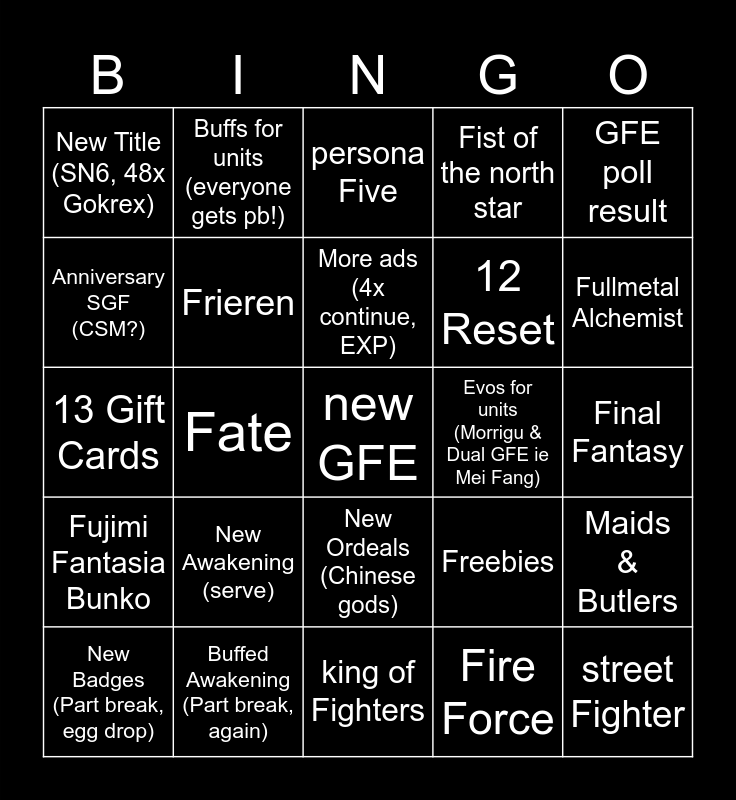 This bingo card has a free space and 24 words: New Awakening (serve), Buffed Awakening (Part break, again), More ads (4x continue, EXP), New Badges (Part break, egg drop), GFE poll result, New Title (SN6, 48x Gokrex), Anniversary SGF (CSM?), Buffs for units (everyone gets pb!), Evos for units (Morrigu & Dual GFE ie Mei Fang), New Ordeals (Chinese gods), 12 Reset, 13 Gift Cards, Freebies, Maids & Butlers, Frieren, Fire Force, Final Fantasy, persona Five, Fullmetal Alchemist, Fate, street Fighter, Fujimi Fantasia Bunko, Fist of the north star and king of Fighters.