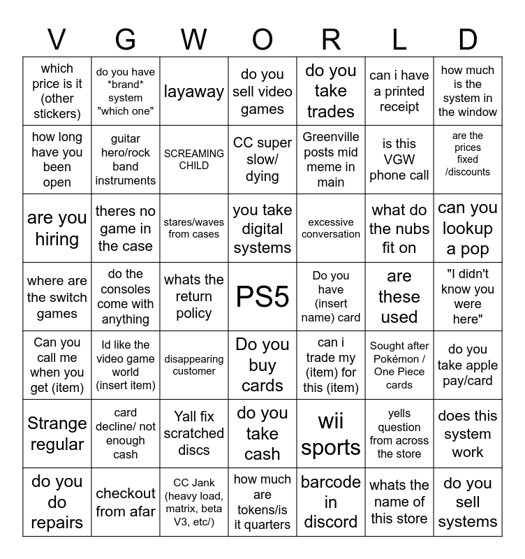 This bingo card has a free space and 62 words: do you work here, where are the switch games, how much is the manga, theres no game in the case, do you sell systems, does this system work, how much is the system in the window, doesnt know the # of the statue, guitar hero/rock band instruments, do you do repairs, do you sell video games, do you take cash, can i have a printed receipt, Do you have (insert name) card, is that all the games you have, which price is it (other stickers), is this VGW phone call, do you take trades, do you have (game that doesnt exist), how long have you been open, are the prices fixed /discounts, layaway, can you lookup a pop, whats the return policy, do you have xbox one controllers, can i trade my (item) for this (item), Id like the video game world (insert item), are the display posters for sale, what do the nubs fit on, do you take apple pay/card, can you go higher on this trade, Yall fix scratched discs, whats the name of this store, is every game tested, are you hiring, do you have *brand* system "which one", wii sports, Sought after Pokémon / One Piece cards, Greenville posts mid meme in main, are these used, CC super slow/ dying, yells question from across the store, stares/waves from cases, customer sitting/ crawling on floor, SCREAMING CHILD, excessive conversation, disappearing customer, checkout from afar, how much are tokens/is it quarters, barcode in discord, you take digital systems, do the consoles come with anything, ill be back for that, card decline/ not enough cash, Doesn't know how to open Ramune, "I didn't know you were here", Do you buy cards, Strange regular, CC Jank (heavy load, matrix, beta V3, etc/), Nick posts AI Video, Can you call me when you get (item) and Scam Call.