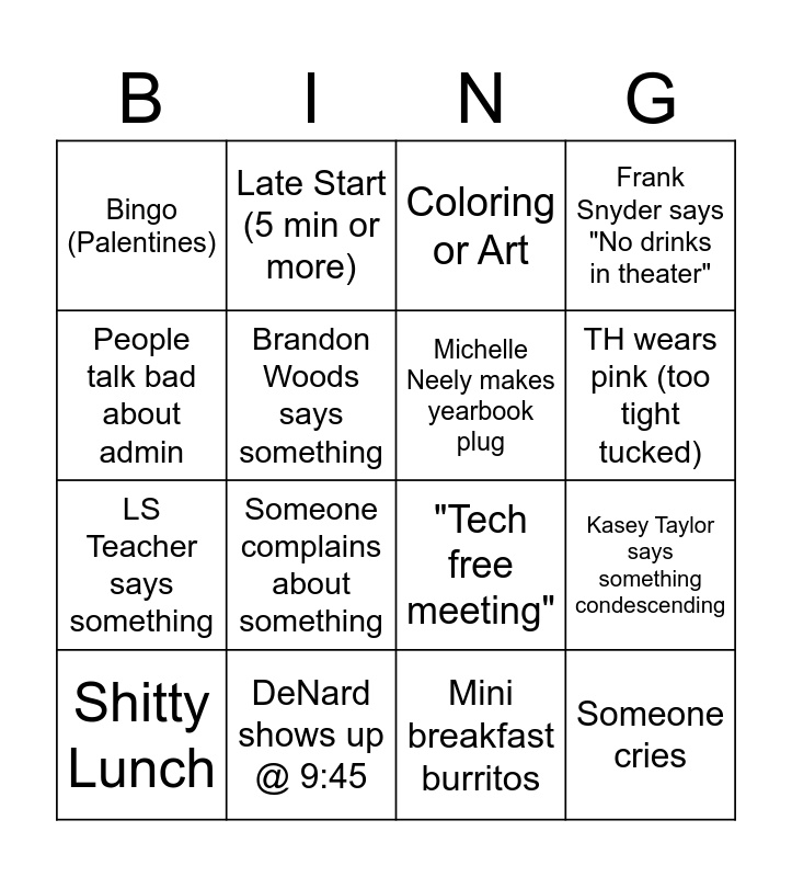 This bingo card has 16 words: Shitty Lunch, DeNard shows up @ 9:45, Coloring or Art, Frank Snyder says "No drinks in theater", People talk bad about admin, Late Start (5 min or more), "Tech free meeting", Kasey Taylor says something condescending, Bingo (Palentines), Brandon Woods says something, Mini breakfast burritos, TH wears pink (too tight tucked), LS Teacher says something, Someone complains about something, Michelle Neely makes yearbook plug and Someone cries.