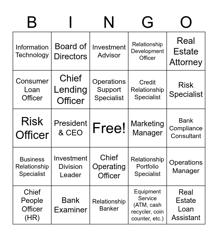 This bingo card has a free space and 28 words: Operations Manager, Agriculture & Commercial Credit Officer, Credit Relationship Specialist, Equipment Service (ATM, cash recycler, coin counter, etc.), Consumer Loan Officer, Investment Advisor, Board of Directors, Business Relationship Specialist, Marketing Manager, Chief People Officer (HR), Risk Officer, Relationship Development Officer, Bank Examiner, Relationship Banker, Risk Specialist, Mortgage Loan Officer, Investment Division Leader, Chief Lending Officer, Operations Support Specialist, Chief Operating Officer, Information Technology, Receptionist, Real Estate Loan Assistant, President & CEO, Bank Compliance Consultant, Relationship Portfolio Specialist, Real Estate Attorney and Underwriter.