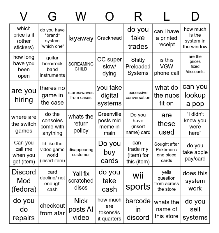 This bingo card has a free space and 62 words: do you work here, where are the switch games, how much is the manga, theres no game in the case, do you sell systems, does this system work, how much is the system in the window, doesnt know the # of the statue, guitar hero/rock band instruments, do you do repairs, Crackhead, do you take cash, can i have a printed receipt, Do you have (insert name) card, is that all the games you have, which price is it (other stickers), is this VGW phone call, do you take trades, do you have (game that doesnt exist), how long have you been open, are the prices fixed /discounts, layaway, can you lookup a pop, whats the return policy, do you have xbox one controllers, can i trade my (item) for this (item), Id like the video game world (insert item), are the display posters for sale, what do the nubs fit on, do you take apple pay/card, can you go higher on this trade, Yall fix scratched discs, whats the name of this store, is every game tested, are you hiring, do you have *brand* system "which one", wii sports, Sought after Pokémon / one piece cards, Shitty Preloaded Systems, are these used, CC super slow/ dying, yells question from across the store, stares/waves from cases, customer sitting/ crawling on floor, SCREAMING CHILD, excessive conversation, disappearing customer, checkout from afar, how much are tokens/is it quarters, barcode in discord, you take digital systems, do the consoles come with anything, ill be back for that, card decline/ not enough cash, Doesn't know how to open Ramune, "I didn't know you were here", Do you buy cards, Discord Mod (fedora), Nick posts AI video, CC Jank (heavy load, matrix, beta v3, etc.), Can you call me when you get (item) and Scam call.