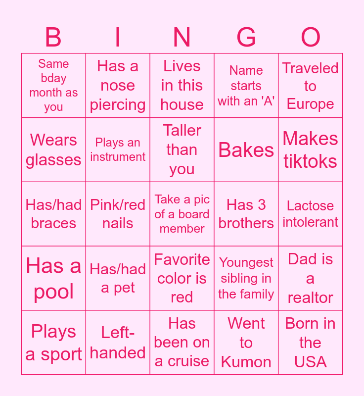 This bingo card has a free space and 24 words: Has/had a pet, Left-handed, Taller than you, Plays a sport, Traveled to Europe, Same bday month as you, Wears glasses, Has a nose piercing, Has 3 brothers, Favorite color is red, Bakes, Has/had braces, Youngest sibling in the family, Dad is a realtor, Plays an instrument, Went to Kumon, Lactose intolerant, Lives in this house, Makes tiktoks, Pink/red nails, Born in the USA, Has a pool, Name starts with an 'A' and Has been on a cruise.
