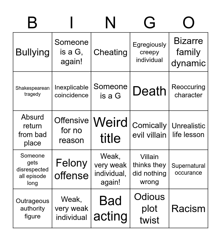 This bingo card has a free space and 24 words: Felony offense, Weak, very weak individual, Someone is a G, Outrageous authority figure, Bizarre family dynamic, Bullying, Shakespearean tragedy, Someone is a G, again!, Comically evil villain, Weak, very weak individual, again!, Death, Absurd return from bad place, Villain thinks they did nothing wrong, Supernatural occurance, Inexplicable coincidence, Odious plot twist, Unrealistic life lesson, Cheating, Reoccuring character, Offensive for no reason, Racism, Someone gets disrespected all episode long, Egregiously creepy individual and Bad acting.