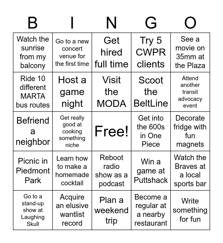 This bingo card has a free space and 24 words: Learn how to make a homemade cocktail, Acquire an elusive wantlist record, Visit the MODA, Go to a stand-up show at Laughing Skull, See a movie on 35mm at the Plaza, Watch the sunrise from my balcony, Ride 10 different MARTA bus routes, Go to a new concert venue for the first time, Get into the 600s in One Piece, Reboot radio show as a podcast, Scoot the BeltLine, Befriend a neighbor, Win a game at Puttshack, Watch the Braves at a local sports bar, Host a game night, Become a regular at a nearby restaurant, Decorate fridge with fun magnets, Get hired full time, Attend another transit advocacy event, Get really good at cooking something niche, Write something for fun, Picnic in Piedmont Park, Try 5 CWPR clients and Plan a weekend trip.