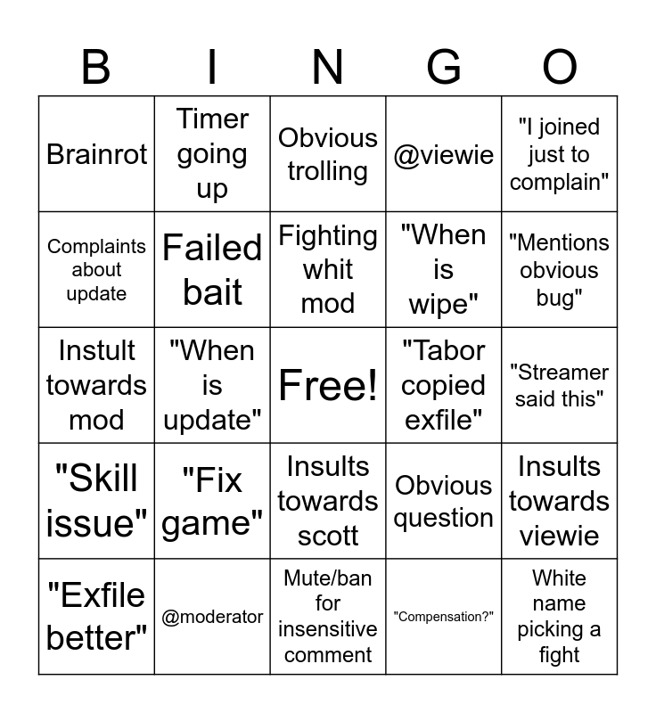 This bingo card has a free space and 24 words: "Fix game", @moderator, Fighting whit mod, "Exfile better", "I joined just to complain", Brainrot, Complaints about update, Timer going up, "Tabor copied exfile", Insults towards scott, "When is wipe", Instult towards mod, Obvious question, Insults towards viewie, Failed bait, "Compensation?", "Streamer said this", Obvious trolling, "Mentions obvious bug", "When is update", White name picking a fight, "Skill issue", @viewie and Mute/ban for insensitive comment.
