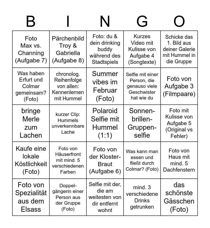 This bingo card has a free space and 24 words: Foto von Häuserfront mit mind. 5 verschiedenen Farben, Doppel-gängerin einer Person aus der Gruppe (Foto), Summer vibes im Februar (Foto), Foto von Spezialität aus dem Elsass, Schicke das 1. Bild aus deiner Galerie mit Hummel in die Gruppe, Foto Max vs. Channing (Aufgabe 7), Was haben Erfurt und Colmar gemeinsam? (Foto), Pärchenbild Troy & Gabriella (Aufgabe 8), Sonnen- brillen-Gruppen-selfie, Foto von der Kloster-Braut (Aufgabe 6), Selfie mit einer Person, die genauso viele Geschwister hat wie du, bringe Merle zum Lachen, Was kann man essen und fließt durch Colmar? (Foto), Foto von Haus mit mind. 5 Dachfenstern, chronolog. Reihenfolge von allen: Kennenlernen mit Hummel, mind. 3 verschiedene Drinks getrunken, Foto mit Kulisse von Aufgabe 5 (Original vs Fehler), Foto: du & dein drinking buddy während des Stadtspiels, Foto von Aufgabe 3 (Filmpaare), kurzer Clip: Hummels unverkennbare Lache, das schönste Gässchen (Foto), Kaufe eine lokale Köstlichkeit (Foto), Kurzes Video mit Kulisse von Aufgabe 4 (Songtexte) and Selfie mit der, die am weitesten von dir entfernt wohnt.