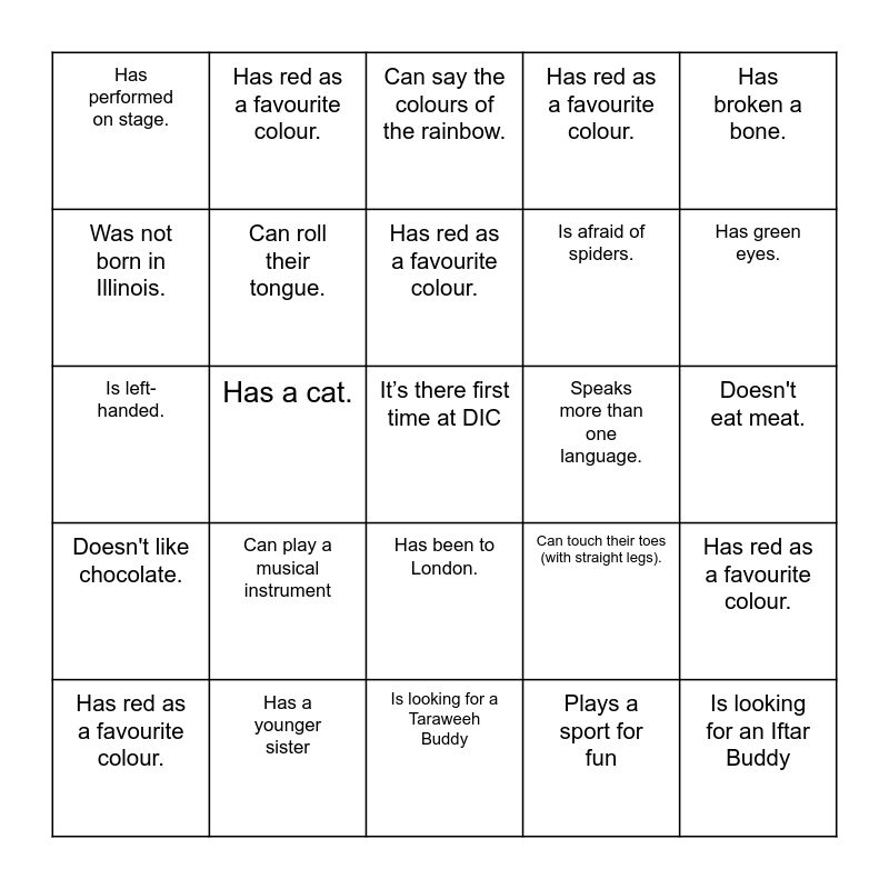 This bingo card has a free space and 29 words: Has red as a favourite colour., Has never been ice skating, Has a cat., Can do a handstand., Has performed on stage., Can say the colours of the rainbow., Can roll their tongue., Can play a musical instrument, Speaks more than one language., Has a younger sister, Doesn't eat meat., Is looking for an Iftar Buddy, Is looking for a Taraweeh Buddy, Plays a sport for fun, Has green eyes., Has never been on an airplane, Has been to London., Doesn't like chocolate., Has broken a bone., Is left-handed., Can touch their toes (with straight legs)., Has the same birth month as you., Is afraid of spiders., Was not born in Illinois., Has red as a favourite colour., Has red as a favourite colour., Has red as a favourite colour., Has red as a favourite colour. and Has red as a favourite colour..