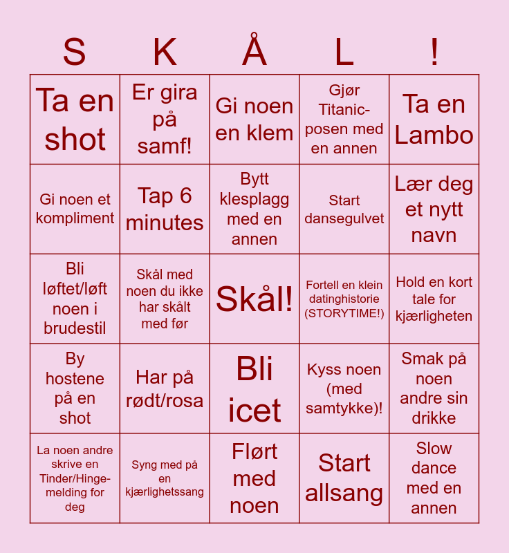 This bingo card has a free space and 27 words: Kyss noen (med samtykke)!, Hjelp med å rydde<3, Start dansegulvet, Flørt med noen, Gi noen et kompliment, Gi noen en klem, Er gira på samf!, By hostene på en shot, Fortell en klein datinghistorie (STORYTIME!), Smak på noen andre sin drikke, Bli løftet/løft noen i brudestil, Gjør Titanic-posen med en annen, La noen andre skrive en Tinder/Hinge-melding for deg, Syng med på en kjærlighetssang, Lær deg et nytt navn, Vinn i Beer Pong, Tap 6 minutes, Bytt klesplagg med en annen, Har på rødt/rosa, Ta en shot, Hold en kort tale for kjærligheten, Start allsang, Skål med noen du ikke har skålt med før, Slow dance med en annen, Bli icet, Ta en Lambo and Foreslå en lek.
