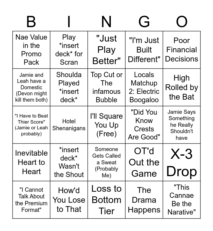 This bingo card has a free space and 24 words: *insert deck* Wasn't the Shout, How'd You Lose to That, Top Cut or The infamous Bubble, "I Cannot Talk About the Premium Format", Poor Financial Decisions, Nae Value in the Promo Pack, Jamie and Leah have a Domestic (Devon might kill them both), Play *insert deck* for Scran, "Did You Know Crests Are Good", Someone Gets Called a Sweat (Probably Me), Locals Matchup 2: Electric Boogaloo, "I Have to Beat Thier Score" (Jamie or Leah probably), OT'd Out the Game, X-3 Drop, Shoulda Played *insert deck*, The Drama Happens, Jamie Says Something he Really Shouldn't have, "Just Play Better", High Rolled by the Bat, Hotel Shenanigans, "This Cannae Be the Narative", Inevitable Heart to Heart, "I'm Just Built Different" and Loss to Bottom Tier.