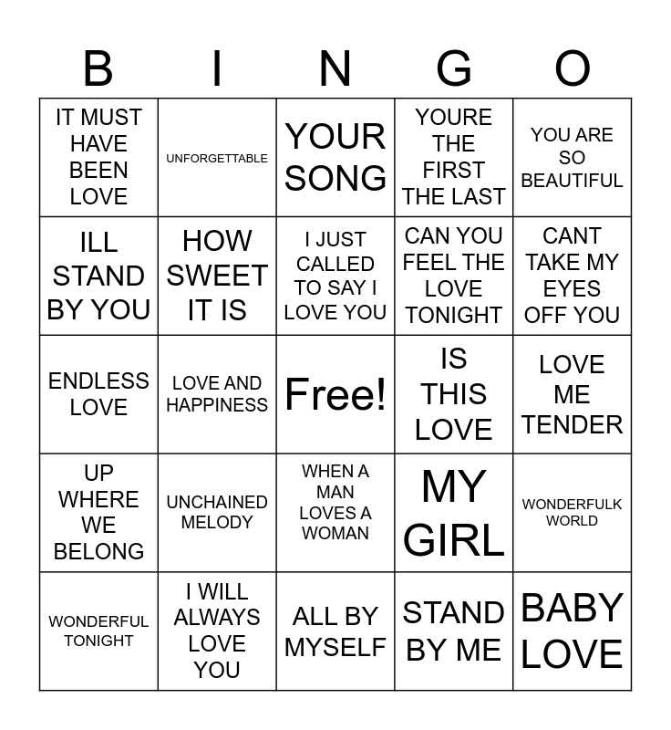 This bingo card has a free space and 24 words: UNCHAINED MELODY, I WILL ALWAYS LOVE YOU, I JUST CALLED TO SAY I LOVE YOU, WONDERFUL TONIGHT, YOU ARE SO BEAUTIFUL, IT MUST HAVE BEEN LOVE, ILL STAND BY YOU, UNFORGETTABLE, IS THIS LOVE, WHEN A MAN LOVES A WOMAN, CAN YOU FEEL THE LOVE TONIGHT, ENDLESS LOVE, MY GIRL, WONDERFULK WORLD, HOW SWEET IT IS, STAND BY ME, LOVE ME TENDER, YOUR SONG, CANT TAKE MY EYES OFF YOU, LOVE AND HAPPINESS, BABY LOVE, UP WHERE WE BELONG, YOURE THE FIRST THE LAST and ALL BY MYSELF.