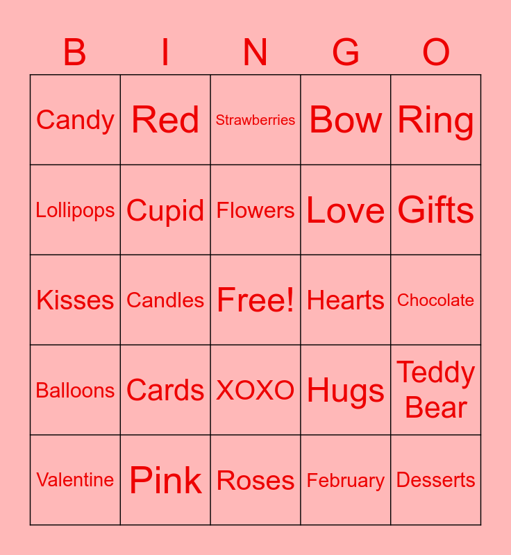This bingo card has a free space and 24 words: Cards, Pink, Flowers, Valentine, Ring, Candy, Lollipops, Red, Hearts, XOXO, Love, Kisses, Hugs, Teddy Bear, Cupid, February, Chocolate, Strawberries, Gifts, Candles, Desserts, Balloons, Bow and Roses.