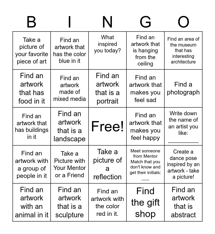 This bingo card has a free space and 24 words: Take a Picture with Your Mentor or a Friend, Find an artwork that is a sculpture, Find an artwork that is a portrait, Find an artwork with an animal in it, Find an area of the museum that has interesting architecture, Take a picture of your favorite piece of art, Find an artwork that has food in it, Find an artwork that has the color blue in it, Find an artwork that makes you feel happy, Take a picture of a reflection, Find an artwork that makes you feel sad, Find an artwork that has buildings in it, Meet someone from Mentor Match that you don't know and get their initials: ___, Create a dance pose inspired by an artwork - take a picture!, Find an artwork made of mixed media, Find the gift shop, Write down the name of an artist you like: __________, What inspired you today?, Find a photograph, Find an artwork that is a landscape, Find an artwork that is abstract, Find an artwork with a group of people in it, Find an artwork that is hanging from the ceiling and Find an artwork with the color red in it..