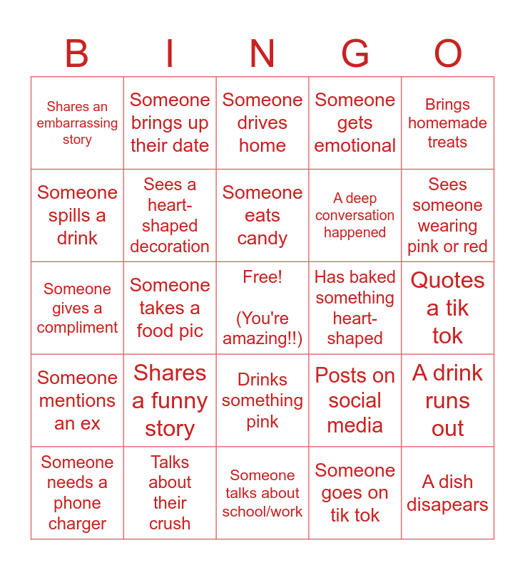This bingo card has a free space and 26 words: Drinks something pink, Someone goes on tik tok, Someone eats candy, Talks about their crush, Brings homemade treats, Shares an embarrassing story, Someone spills a drink, Someone brings up their date, Quotes a tik tok, Posts on social media, A deep conversation happened, Someone gives a compliment, A drink runs out, Someone needs a phone charger, Someone takes a food pic, A guest arrives late, Someone gets emotional, Someone mentions an ex, Someone drives home, A dish disapears, Sees someone wearing pink or red, Someone talks about school/work, Has baked something heart-shaped, Shares a funny story, Sees a heart-shaped decoration and Someone pours themselves a drink.