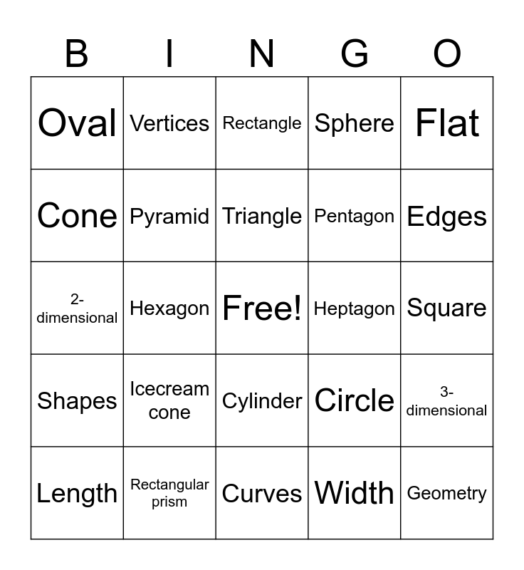 This bingo card has a free space and 24 words: Length, Icecream cone, Triangle, Width, Flat, Oval, Vertices, Rectangle, Heptagon, Square, 2-dimensional, Pyramid, Circle, 3-dimensional, Cone, Rectangular prism, Curves, Sphere, Edges, Shapes, Hexagon, Cylinder, Pentagon and Geometry.