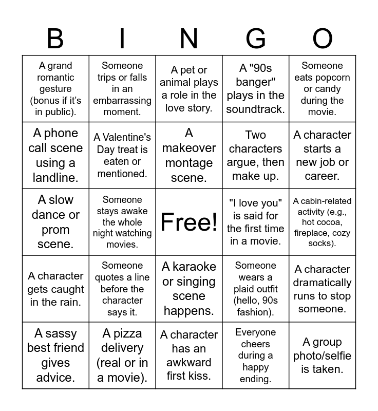 This bingo card has a free space and 25 words: Someone quotes a line before the character says it., A character has an awkward first kiss., A makeover montage scene., A sassy best friend gives advice., Someone eats popcorn or candy during the movie., A grand romantic gesture (bonus if it’s in public)., A phone call scene using a landline., Someone trips or falls in an embarrassing moment., "I love you" is said for the first time in a movie., A karaoke or singing scene happens., Two characters argue, then make up., A slow dance or prom scene., Someone wears a plaid outfit (hello, 90s fashion)., A character dramatically runs to stop someone., A Valentine's Day treat is eaten or mentioned., A cheesy romantic line makes someone laugh out loud., A cabin-related activity (e.g., hot cocoa, fireplace, cozy socks)., A pet or animal plays a role in the love story., A character starts a new job or career., Someone stays awake the whole night watching movies., A group photo/selfie is taken., A pizza delivery (real or in a movie)., A character gets caught in the rain., A "90s banger" plays in the soundtrack. and Everyone cheers during a happy ending..