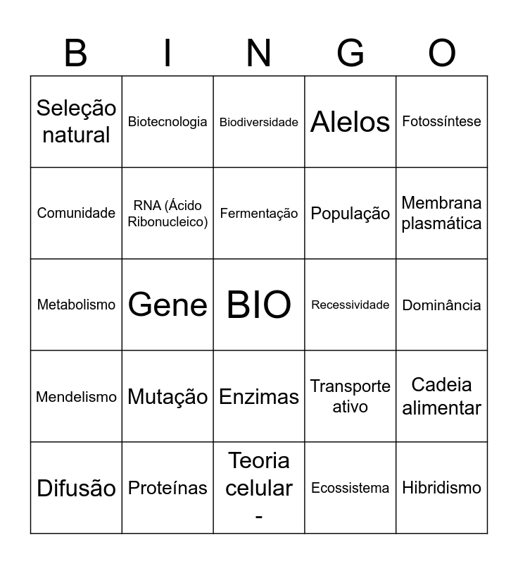 This bingo card has a free space and 40 words: Célula, Metabolismo, DNA (Ácido Desoxirribonucleico), RNA (Ácido Ribonucleico), Proteínas, Enzimas, Fermentação, Respiração celular, Fotossíntese, Mendelismo, Gene, Alelos, Hibridismo, Dominância, Recessividade, Mutação, Evolução, Seleção natural, Especiação, Biodiversidade, Cadeia alimentar, Ecossistema, População, Comunidade, Nicho ecológico, Biomas, Cloroplastos, Mitose, Meiose, Cromossomos, Ciclo celular, Difusão, Osmose, Transporte ativo, Membrana plasmática, Teoria celular -, Homeostase, Sistema imunológico, Biotecnologia and Clonagem.
