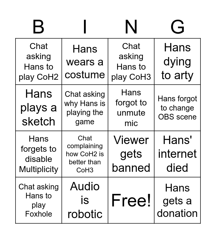 This bingo card has 17 words: Free!, Chat asking Hans to play Foxhole, Chat asking Hans to play CoH3, Chat asking Hans to play CoH2, Chat complaining how CoH2 is better than CoH3, Hans dying to arty, Hans' internet died, Hans forgot to unmute mic, Hans forgot to change OBS scene, Chat asking why Hans is playing the game, Audio is robotic, Viewer gets banned, Hans plays a sketch, Hans wears a costume, Hans forgets to disable Multiplicity, Hans gets a sub and Hans gets a donation.
