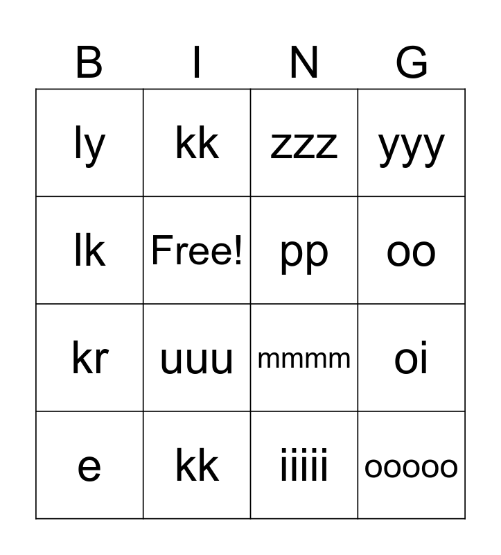 This bingo card has 52 words: 1, e, r, t, u, mm, kk, ll, Free!, oo, pp, pp, ii, jj, ll, ll, oo, kk, mk, lk, oi, ki, ly, kr, jjj, ipo, lll, hhh, uuu, ooo, ttt, yyy, uuu, iii, ooo, zzz, uio, lkj, mmb, nmmmm, yyyyy, iiiii, ooooo, ppppp, hjuy, jjjjj, kkkkk, mmmm, gtf, kjh, poi and mmmmmmm.