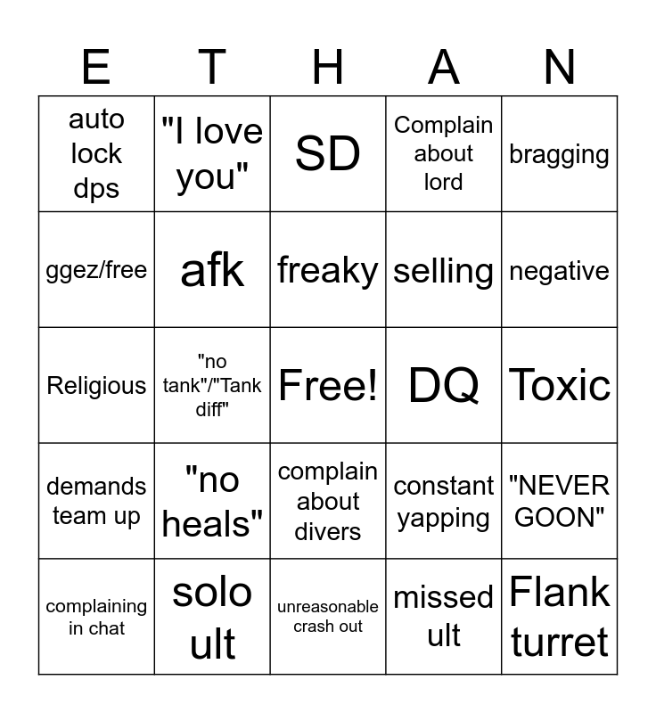 This bingo card has a free space and 24 words: "no heals", solo ult, freaky, complaining in chat, bragging, auto lock dps, ggez/free, "I love you", DQ, complain about divers, selling, Religious, constant yapping, "NEVER GOON", afk, missed ult, Toxic, SD, negative, "no tank"/"Tank diff", Flank turret, demands team up, Complain about lord and unreasonable crash out.