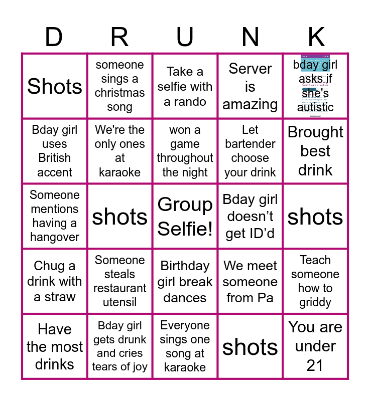 This bingo card has 2 images, a free space and 27 words: We meet someone from Pa, Make a toast without using the word birthday, Let bartender choose your drink, Everyone sings one song at karaoke, Bday girl uses British accent, Take a selfie with a rando, someone sings a christmas song, Chug a drink with a straw, Bday girl doesn’t get ID’d, Teach someone how to griddy, Someone mentions having a hangover, Server is amazing, Have the most drinks, Bday girl gets drunk and cries tears of joy, Brought best drink, Someone's double fisting, We're the only ones at karaoke, won a game throughout the night, Someone steals restaurant utensil, Shots, shots, shots, shots, You are under 21, Birthday girl break dances, bday girl asks if she's autistic and Eat a glizzy.