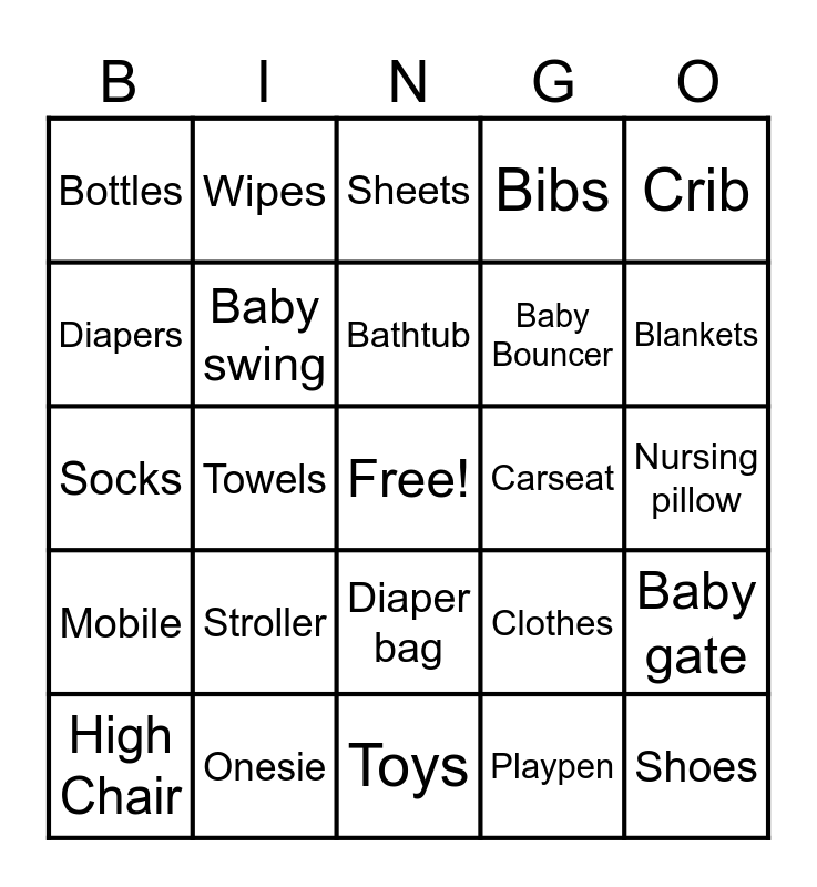 This bingo card has a free space and 24 words: Stroller, Onesie, Bathtub, High Chair, Crib, Bottles, Diapers, Wipes, Carseat, Diaper bag, Baby Bouncer, Socks, Clothes, Baby gate, Baby swing, Playpen, Nursing pillow, Sheets, Blankets, Towels, Shoes, Mobile, Bibs and Toys.
