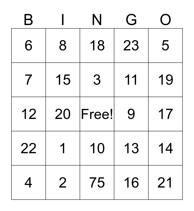 This bingo card has a free space and 24 words: 1, 2, 3, 4, 5, 6, 7, 8, 9, 10, 11, 12, 13, 14, 15, 16, 17, 18, 19, 20, 21, 22, 23 and 75.