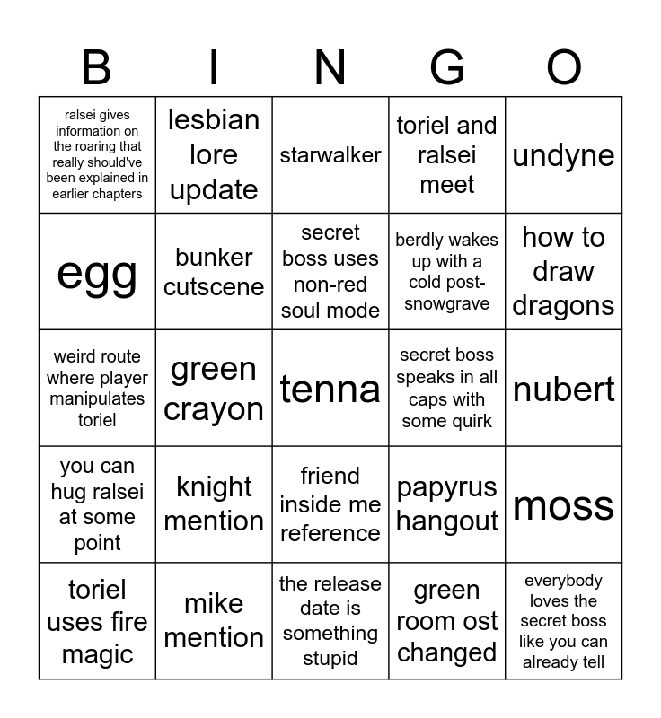This bingo card has a free space and 24 words: knight mention, mike mention, secret boss uses non-red soul mode, toriel uses fire magic, undyne, ralsei gives information on the roaring that really should've been explained in earlier chapters, egg, lesbian lore update, secret boss speaks in all caps with some quirk, friend inside me reference, berdly wakes up with a cold post-snowgrave, weird route where player manipulates toriel, papyrus hangout, moss, bunker cutscene, green room ost changed, nubert, starwalker, how to draw dragons, green crayon, everybody loves the secret boss like you can already tell, you can hug ralsei at some point, toriel and ralsei meet and the release date is something stupid.
