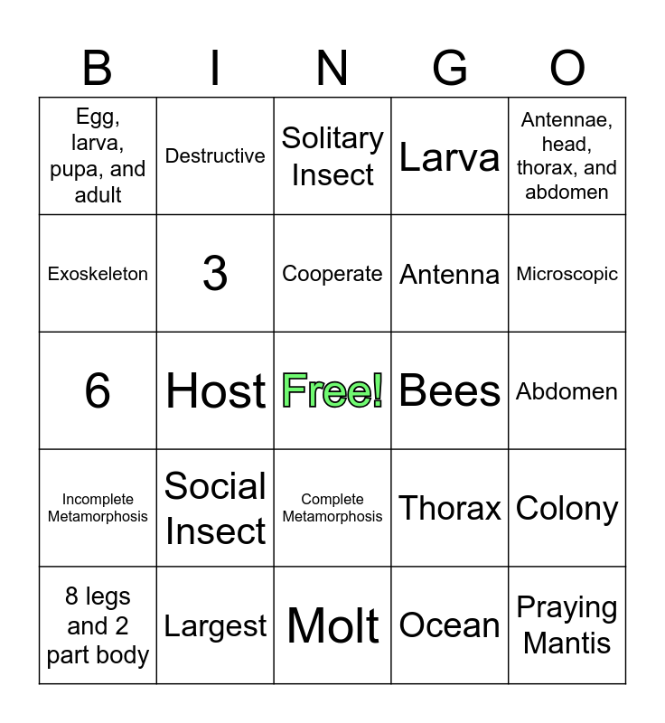 This bingo card has a free space and 24 words: Social Insect, Largest, Cooperate, 8 legs and 2 part body, Antennae, head, thorax, and abdomen, Egg, larva, pupa, and adult, Exoskeleton, Destructive, Bees, Complete Metamorphosis, Antenna, 6, Thorax, Colony, 3, Ocean, Abdomen, Solitary Insect, Microscopic, Host, Praying Mantis, Incomplete Metamorphosis, Larva and Molt.