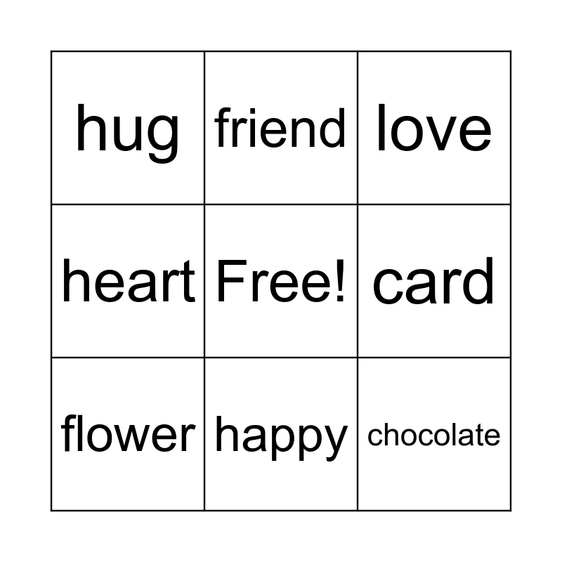 This bingo card has a free space and 8 words: card, love, friend, flower, hug, chocolate, heart and happy.