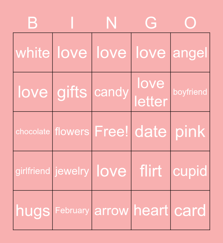 This bingo card has a free space and 29 words: love, February, love, red, angel, white, gifts, candy, date, cupid, hugs, flowers, heart, card, chocolate, poetry, arrow, flirt, boyfriend, girlfriend, jewelry, sweetheart, love letter, pink, love, love, love, love and love.
