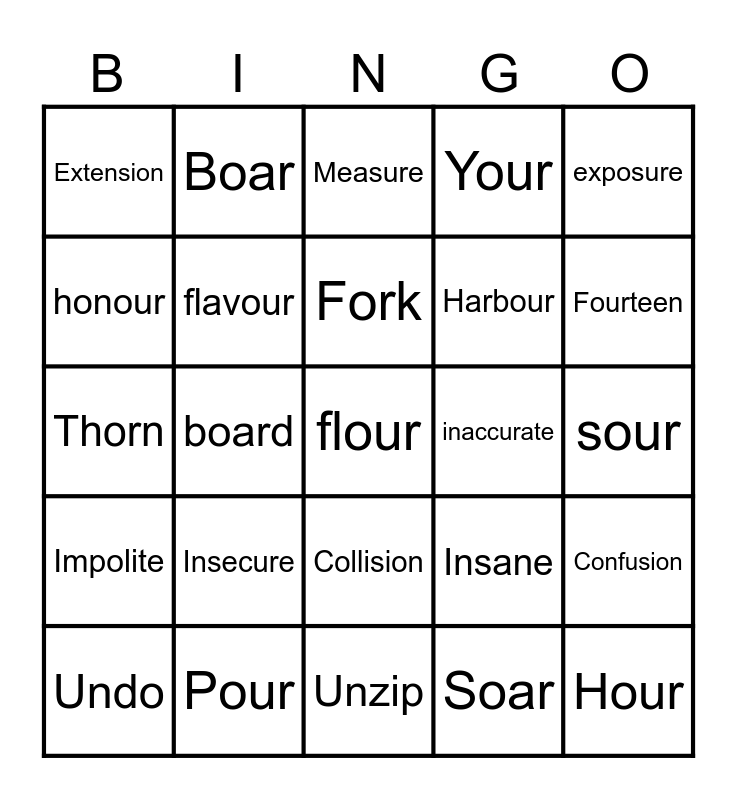 This bingo card has 33 words: Hour, Colour, board, vision, Impolite, flavour, exposure, Undo, Boar, Confusion, Fork, Measure, Uncountable, Improper, inaccurate, Fourteen, Pour, Thorn, Insecure, Insane, Collision, leisure, Extension, sour, Unzip, flour, Your, Harbour, honour, Confusion, Undefined, Soar and corn.