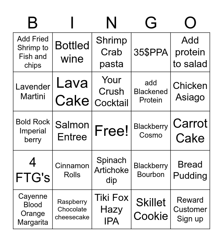 This bingo card has a free space and 24 words: Cinnamon Rolls, Raspberry Chocolate cheesecake, Your Crush Cocktail, Cayenne Blood Orange Margarita, Add protein to salad, Add Fried Shrimp to Fish and chips, Lavender Martini, Bottled wine, Blackberry Cosmo, Spinach Artichoke dip, add Blackened Protein, Bold Rock Imperial berry, Blackberry Bourbon, Bread Pudding, Lava Cake, Skillet Cookie, Carrot Cake, Shrimp Crab pasta, Chicken Asiago, Salmon Entree, Reward Customer Sign up, 4 FTG's, 35$PPA and Tiki Fox Hazy IPA.