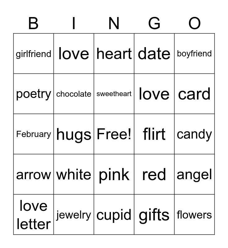 This bingo card has a free space and 24 words: white, jewelry, sweetheart, love letter, boyfriend, girlfriend, poetry, love, flirt, pink, love, February, red, angel, chocolate, gifts, candy, heart, card, hugs, flowers, arrow, date and cupid.