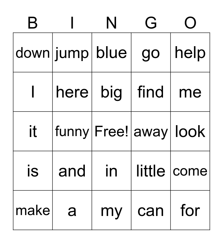 This bingo card has a free space and 24 words: and, a, big, make, help, down, I, jump, away, in, find, it, little, come, here, can, look, blue, me, funny, for, is, go and my.