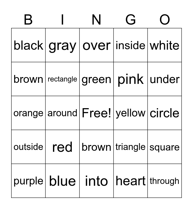 This bingo card has a free space and 24 words: red, blue, green, purple, white, black, brown, gray, yellow, brown, pink, orange, triangle, square, rectangle, heart, circle, over, under, around, through, outside, inside and into.