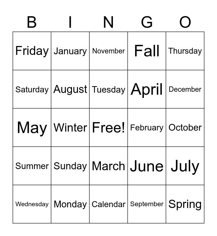This bingo card has a free space and 24 words: Sunday, Monday, Tuesday, Wednesday, Thursday, Friday, Saturday, January, February, March, April, May, June, July, August, September, October, November, December, Winter, Spring, Summer, Fall and Calendar.