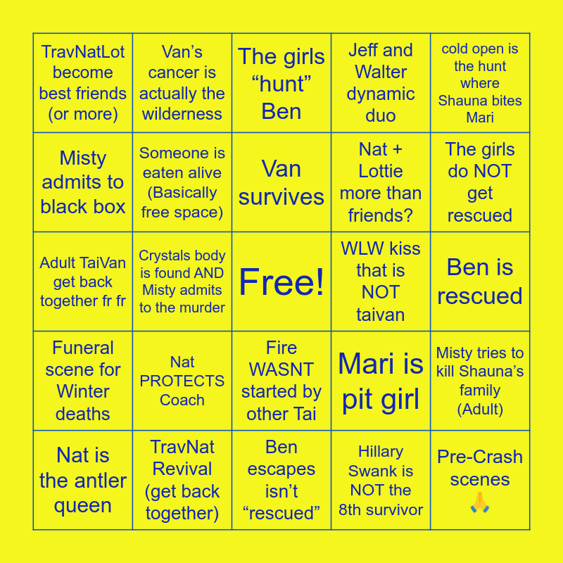 This bingo card has a free space and 24 words: Nat is the antler queen, Nat PROTECTS Coach, Van survives, Hillary Swank is NOT the 8th survivor, cold open is the hunt where Shauna bites Mari, TravNatLot become best friends (or more), Van’s cancer is actually the wilderness, The girls “hunt” Ben, WLW kiss that is NOT taivan, Ben is rescued, Adult TaiVan get back together fr fr, Someone is eaten alive (Basically free space), Mari is pit girl, Misty tries to kill Shauna’s family (Adult), Misty admits to black box, TravNat Revival (get back together), Ben escapes isn’t “rescued”, Jeff and Walter dynamic duo, The girls do NOT get rescued, Funeral scene for Winter deaths, Crystals body is found AND Misty admits to the murder, Fire WASNT started by other Tai, Nat + Lottie more than friends? and Pre-Crash scenes 🙏.