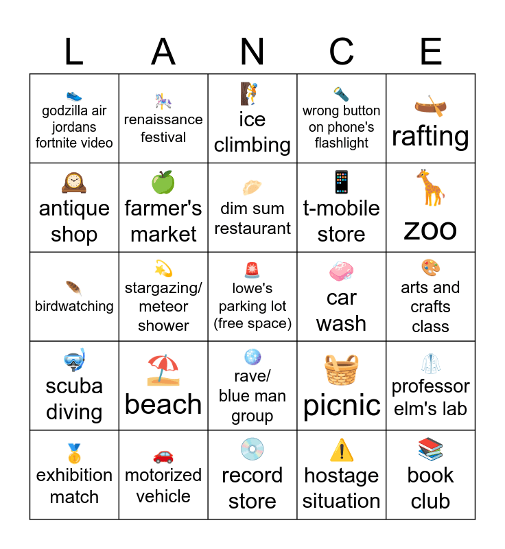 This bingo card has a free space and 24 words: โฑ๏ธ beach, ๐ motorized vehicle, ๐ฅ dim sum restaurant, ๐ฅ exhibition match, ๐ถ rafting, ๐ godzilla air jordans fortnite video, ๐ฐ๏ธ antique shop, ๐ renaissance festival, ๐งผ car wash, ๐ชฉ rave/ blue man group, ๐ฑ t-mobile store, ๐ชถ birdwatching, ๐งบ picnic, ๐ฅผ professor elm's lab, ๐ farmer's market, โ ๏ธ hostage situation, ๐จ arts and crafts class, ๐ง ice climbing, ๐ฆ zoo, ๐ซ stargazing/ meteor shower, ๐ book club, ๐คฟ scuba diving, ๐ฆ wrong button on phone's flashlight and ๐ฟ record store.