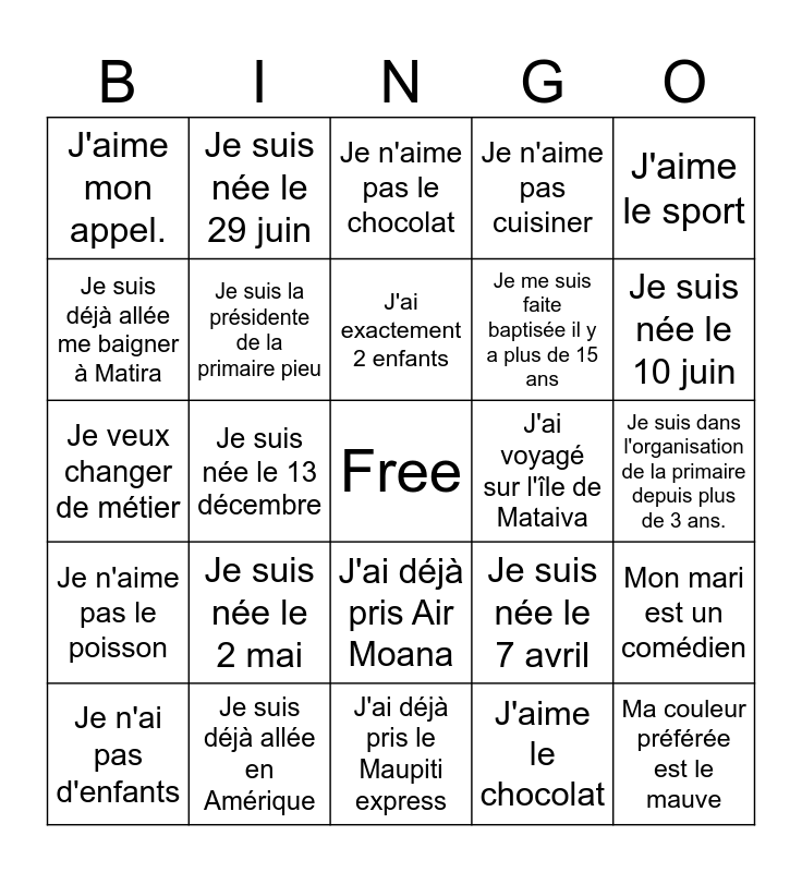 This bingo card has a free space and 24 words: Je suis née le 2 mai, Je suis déjà allée en Amérique, J'ai exactement 2 enfants, Je n'ai pas d'enfants, J'aime le sport, J'aime mon appel., Je suis déjà allée me baigner à Matira, Je suis née le 29 juin, J'ai voyagé sur l'île de Mataiva, J'ai déjà pris Air Moana, Je me suis faite baptisée il y a plus de 15 ans, Je veux changer de métier, Je suis née le 7 avril, Mon mari est un comédien, Je suis la présidente de la primaire pieu, J'aime le chocolat, Je suis dans l'organisation de la primaire depuis plus de 3 ans., Je n'aime pas le chocolat, Je suis née le 10 juin, Je suis née le 13 décembre, Ma couleur préférée est le mauve, Je n'aime pas le poisson, Je n'aime pas cuisiner and J'ai déjà pris le Maupiti express.