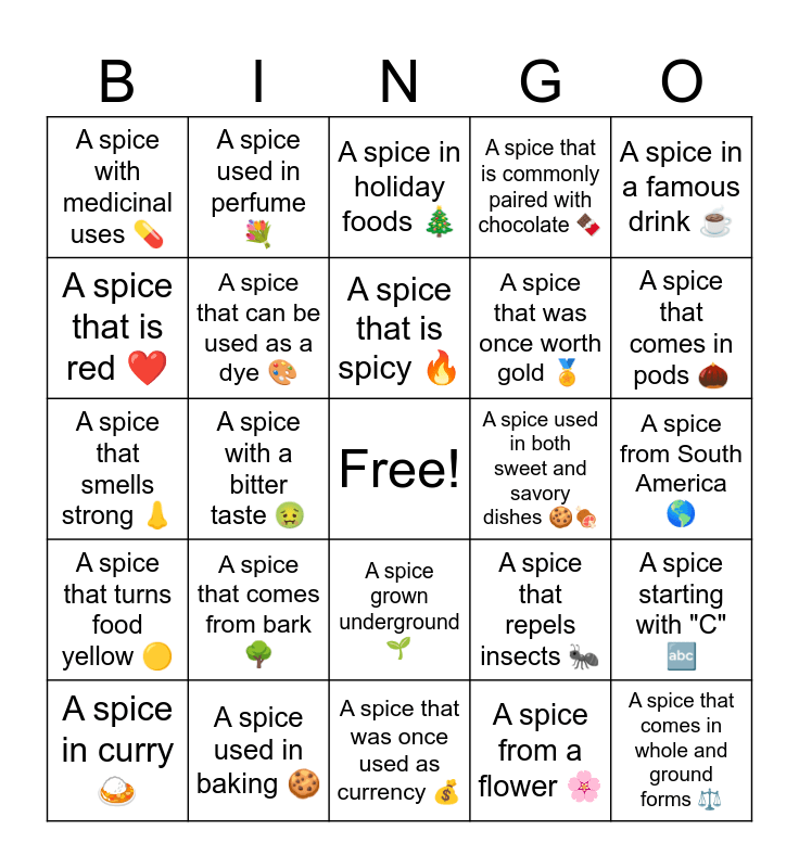 This bingo card has a free space and 24 words: A spice that comes from bark 🌳, A spice used in baking 🍪, A spice that is spicy 🔥, A spice in curry 🍛, A spice in a famous drink ☕, A spice with medicinal uses 💊, A spice that is red ❤️, A spice used in perfume 💐, A spice used in both sweet and savory dishes 🍪🍖, A spice grown underground 🌱, A spice that was once worth gold 🏅, A spice that smells strong 👃, A spice that repels insects 🐜, A spice starting with "C" 🔤, A spice that can be used as a dye 🎨, A spice from a flower 🌸, A spice from South America 🌎, A spice in holiday foods 🎄, A spice that comes in pods 🌰, A spice with a bitter taste 🤢, A spice that comes in whole and ground forms ⚖️, A spice that turns food yellow 🟡, A spice that is commonly paired with chocolate 🍫 and A spice that was once used as currency 💰.