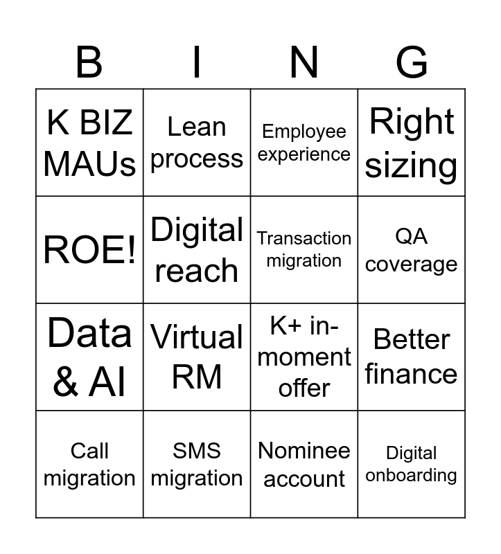 This bingo card has 16 words: SMS migration, Better finance, Employee experience, K BIZ MAUs, Data & AI, Lean process, K+ in-moment offer, Nominee account, ROE!, Digital reach, Call migration, Right sizing, Virtual RM, QA coverage, Transaction migration and Digital onboarding.