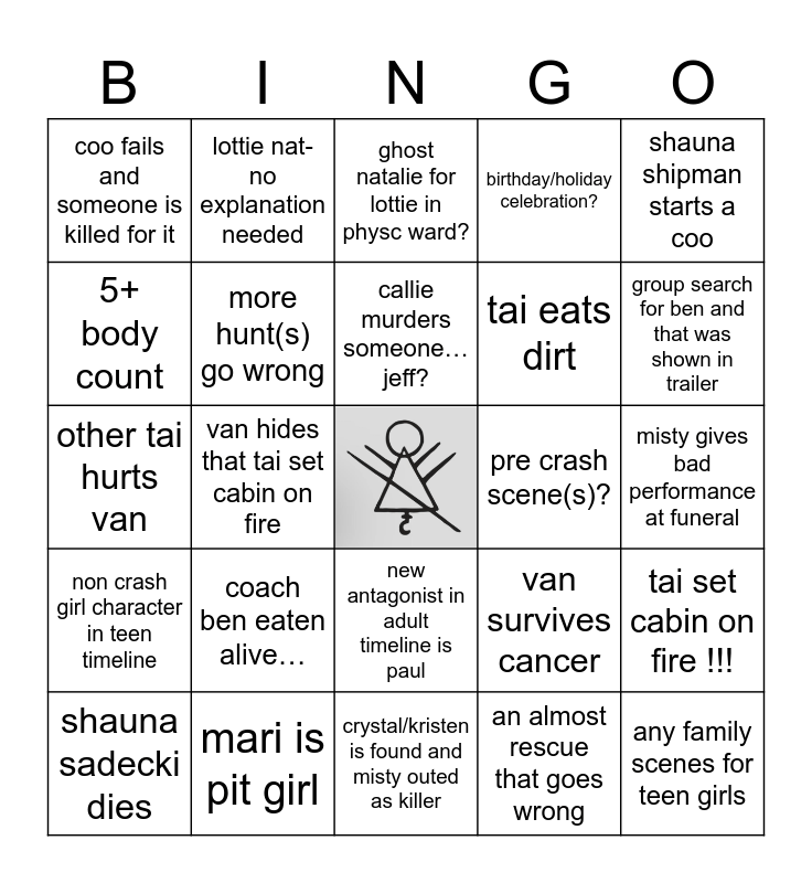 This bingo card has a free space and 24 words: coach ben eaten alive…, mari is pit girl, callie murders someone…jeff?, shauna sadecki dies, shauna shipman starts a coo, coo fails and someone is killed for it, 5+ body count, lottie nat- no explanation needed, pre crash scene(s)?, new antagonist in adult timeline is paul, tai eats dirt, other tai hurts van, van survives cancer, tai set cabin on fire !!!, more hunt(s) go wrong, an almost rescue that goes wrong, misty gives bad performance at funeral, ghost natalie for lottie in physc ward?, group search for ben and that was shown in trailer, van hides that tai set cabin on fire, any family scenes for teen girls, non crash girl character in teen timeline, birthday/holiday celebration? and crystal/kristen is found and misty outed as killer.